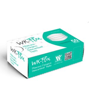 Máscaras embaladas em saco plástico, em caixas de 50 unidades, acomodadas em caixas coletivas.